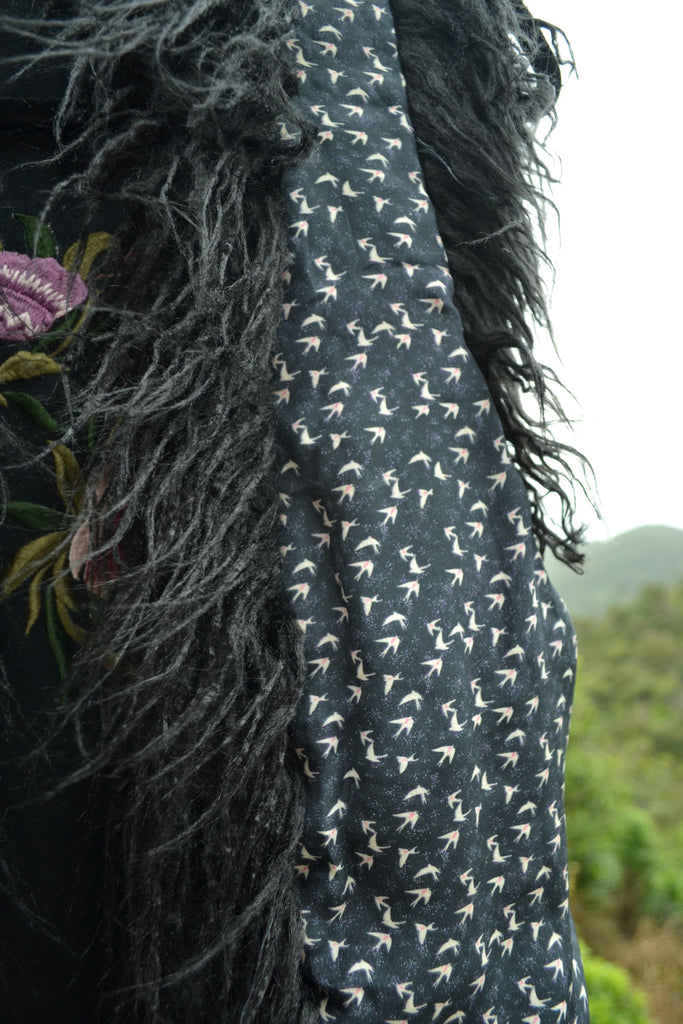 The Midnight Rose Mongolian Vest brings together texture, femininity, and freedom in a single statement piece. Crafted from lightweight cotton and faux Mongolian fur with the Midnight Rose signature floral embroidery on the front and back β€” bold, romantic, and unmistakably AmberDawn.